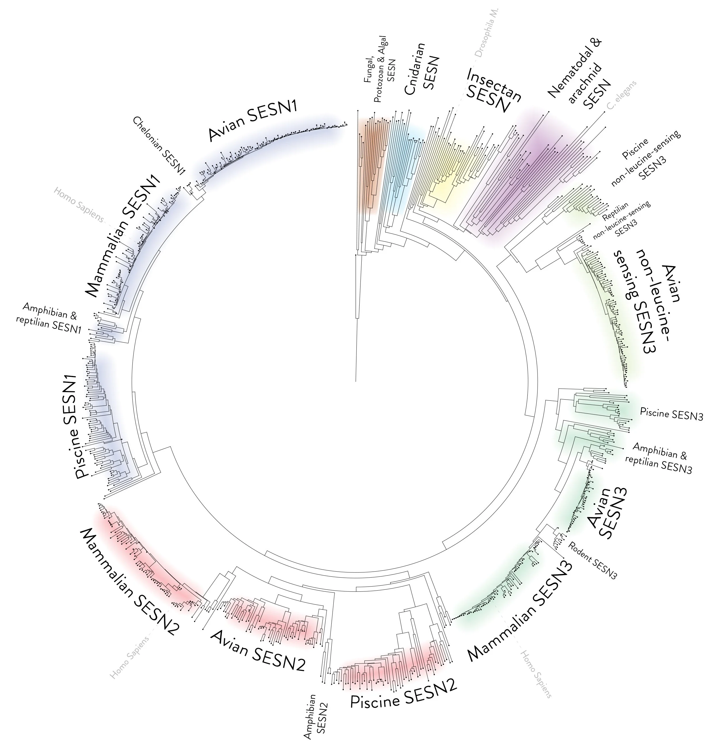 A circular phylogenetic tree based on protein alignments of Sestrin. The tree displays 805 Sestrin and Sestrin-like proteins as nodes at the tip of a leaf. Protein BLAST was used to select species with homologous proteins to the C. Elegans Sestrin sequence. One species of every genus was selected manually via BLAST's taxonomic display, and FASTA sequences were retrieved for each protein. A multiple sequence alignment was performed using EMBL-EBI Clustal Omega. The programme was used to export the alignment as a Newick format phylogenetic tree. The file was imported into the Interactive Tree Of Life (iTOL) programme, and the tool was used to root the tree on the sequence of Naegleria gruberi, and some visual aspects of the tree were adjusted. The figure of the circular tree was exported as an image file. The tree was then annotated and coloured manually using Adobe Photoshop. As this is a protein-aligned phylogenetic tree, the distances on the tree are arbitrary. The distance from a node to the tip of a leaf represents the difference in the sequence from a previous assumed ancestor protein.