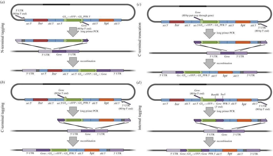 “Figure 2. Long primer PCR tagging and deletion mutagenesis using pPOTv4. (a) N-terminal tagging. (b) C-terminal tagging. (c) Creating a C-terminal deletion mutant. (d) Internal tagging towards the N-terminal end of the gene (using a modified pPOTv4 template).”