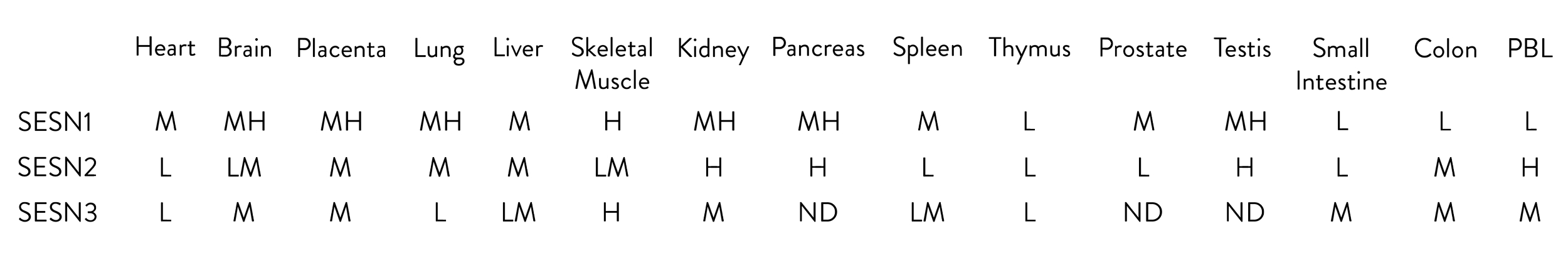 Table - Relative expression of Sestrins in various tissues